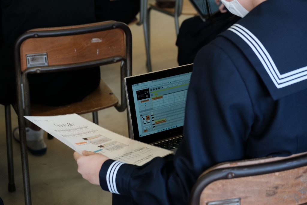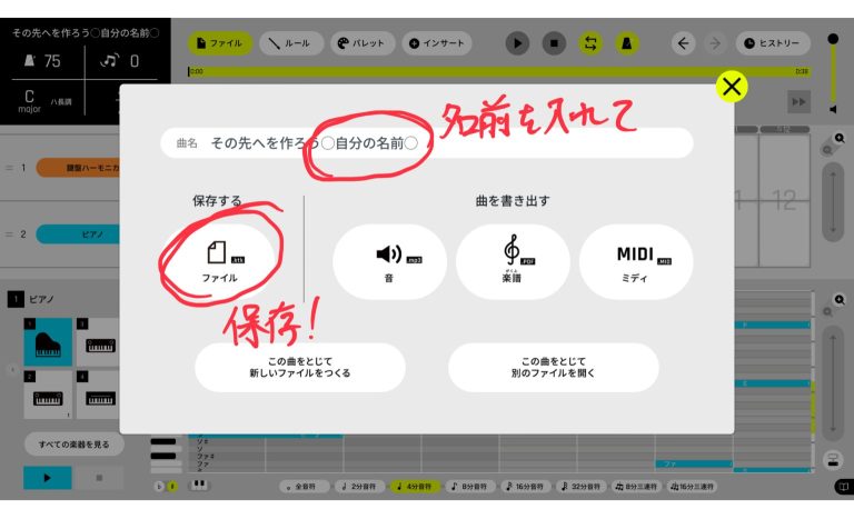 でクラス曲をつくろう。楽譜をみながらドレミを考えて入力しても、耳で聞きながら入力しても良いでしょう